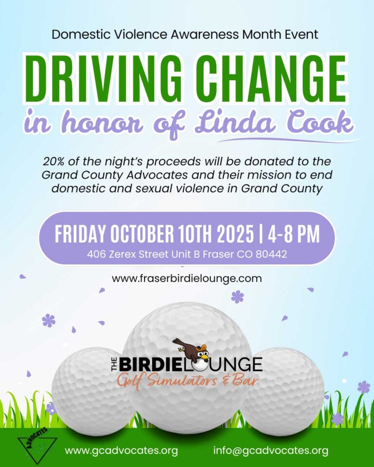 October is Domestic Violence Awareness Month. Join us on October 10th from 4-8 PM at the Birdie Lounge as we remember former board member, Linda Cook. Stop by for a drink, chat, or donate! 20% of proceeds will go towards supporting the Advocates and their mission to end domestic and sexual violence in Grand County. Contact the Birdie Lounge (fraserbirdielounge.com) to reserve your bay!